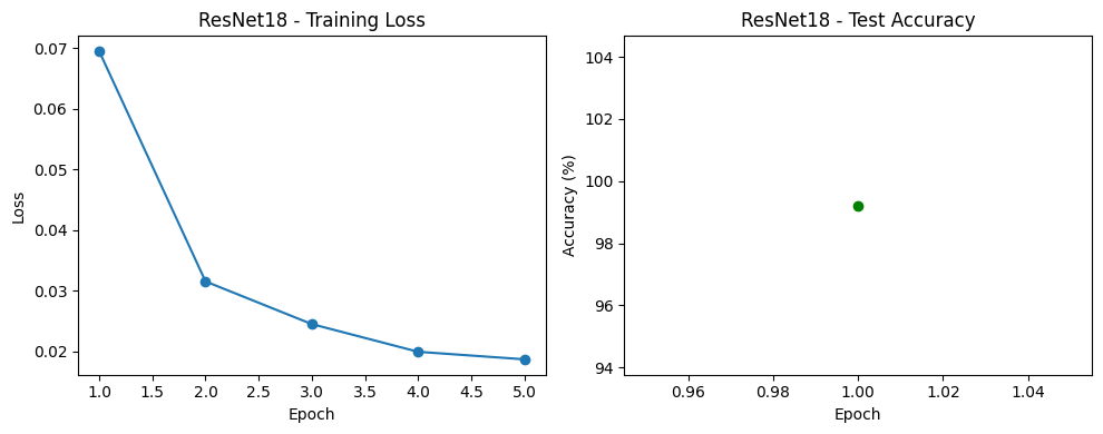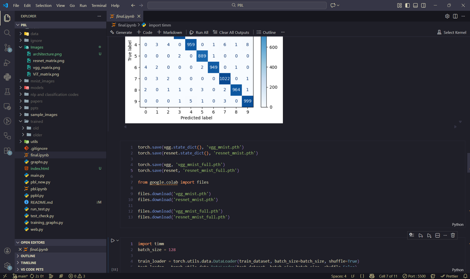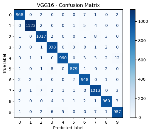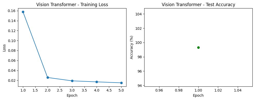 This section presents training loss curves, test accuracy plots, confusion matrices, and implementation snapshots for VGG16, ResNet18, and Vision Transformer models trained on MNIST.