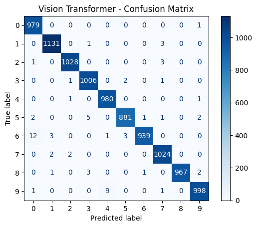 This project evaluates VGG16, ResNet18, and Vision Transformer models on the MNIST handwritten digit dataset using identical preprocessing and training pipelines. Results demonstrate superior performance from Vision Transformers, highlighting the benefit of global attention in visual classification tasks.
